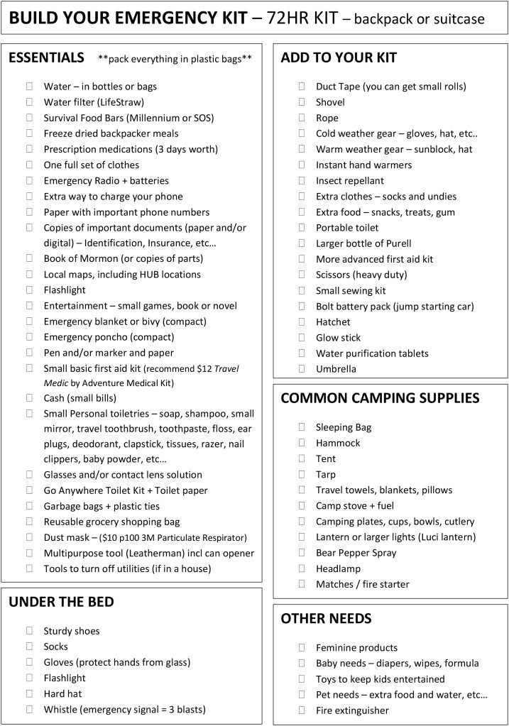 72 Hour Kits – the name is pretty self explanatory. Gather together what you would need to survive for 3 days if you had to evacuate your home. Put it in some type of portable container – backpack, bin, or roller suitcase. Regularly check your kit so it stays functional.