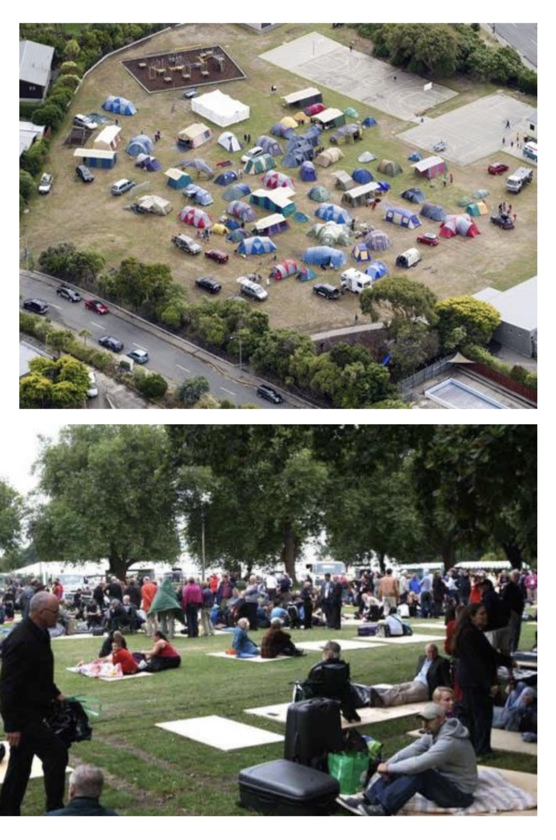 The picture above are folks camping on a school law after the Kaikoura, New Zealand, earthquake and the picture below it are residents of Christchurch, New Zealand, in Hagley Park after the 2011 earthquake.