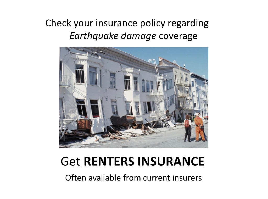 Check your home or renter insurance to see if earthquake damage is covered or can be added. More info can be found on the insurance page, however this Q&A by the Seattle Times is specific to earthquake insurance in Washington.