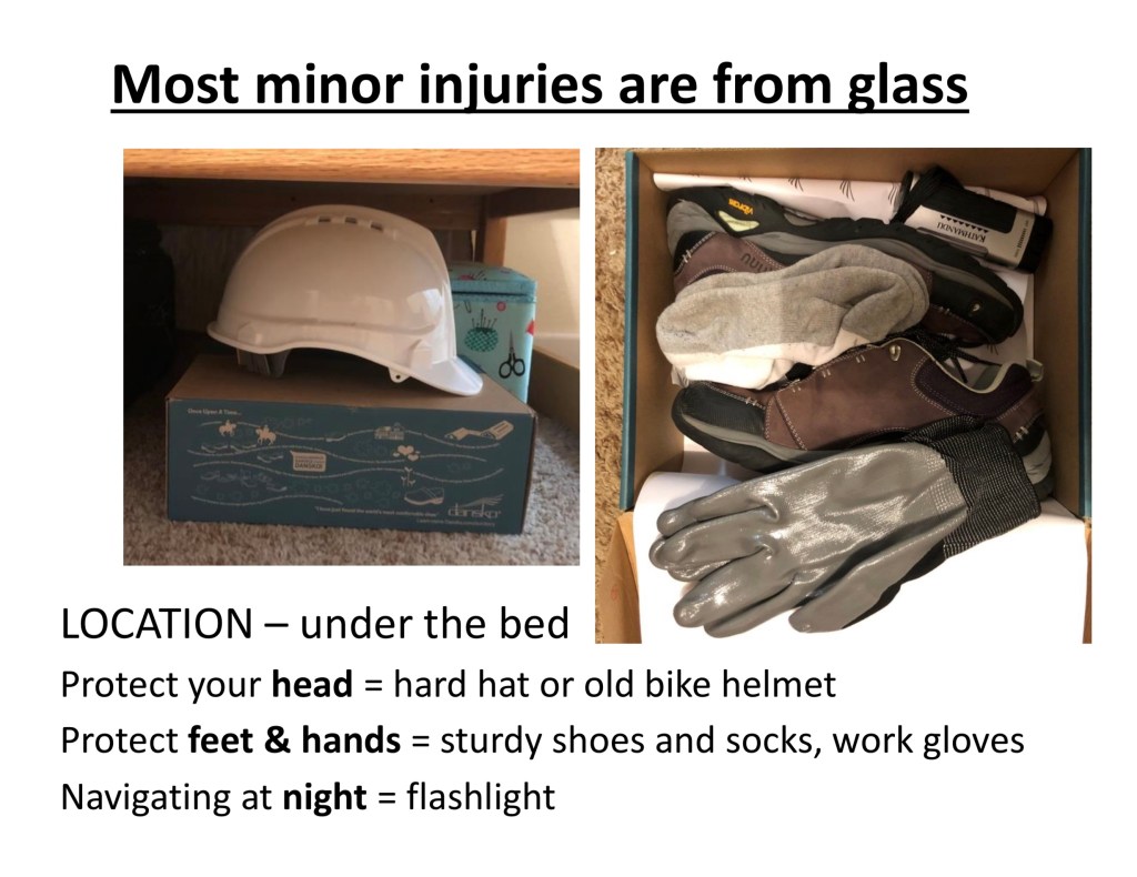 Again, most non-life-threatening injuries from an earthquake are from broken glass. Please prepare accordingly. If in bed, the safest place is to stay in bed – and this is one reason why. Keep under the bed gear to protect your feet, hands, and head. Also, make sure to have a good first aid kit on hand.