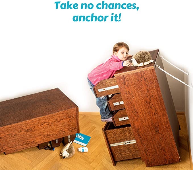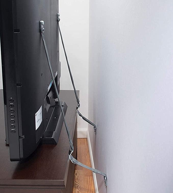 Make sure your TV is anchored to the wall, as well as anchoring the furniture it is sitting on. Also anchor bookshelves, and anything that could tip over. Any baby proofing straps will work, although it is recommended to not use the all plastic straps.