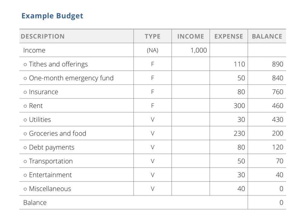 The sample budget below is from the Self-Reliance Personal Finance manual. Note that aside from the net income (in) and expense columns (out), there is a type column listed. This is to mark if a budget item is a “fixed” or “variable” expense. Fixed expenses are the same each month, whereas variable expenses can fluctuate. You may also wish to further mark which expenses are mandatory non-negotiable “needs” vs what items are optional or ideal “wants.” Note that this example is shown in category format, whereas the raw data of your budget may be further itemized.