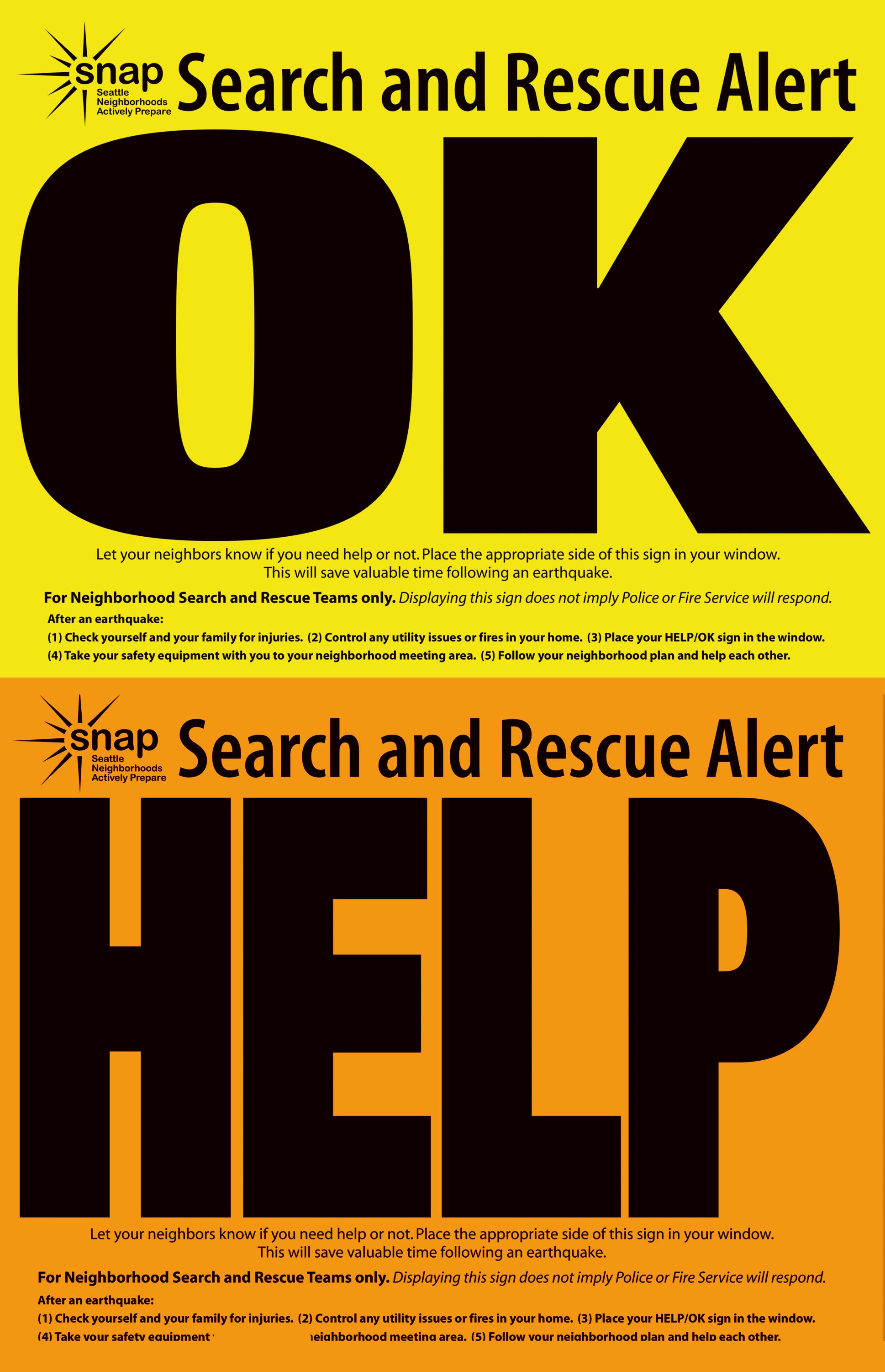 The following signs can be printed onto standard sized paper and are used in home windows after a major disaster to help direct emergency workers. You can print a set to include in your kit here.