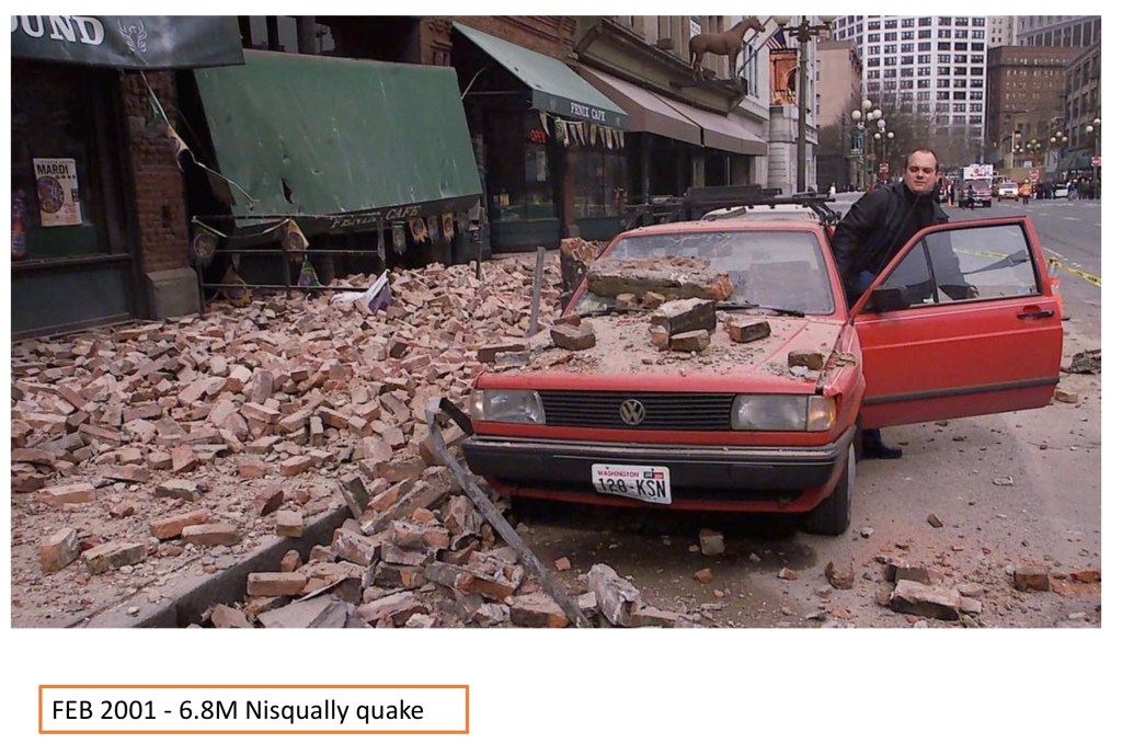 During an earthquake DO NOT run outside. Falling bricks, glass, masonry, and other bits of buildings are very deadly in an earthquake. There is a triangle of danger right outside of a building, so if downtown it may be safer to stay inside after an earthquake. An exception would be if you live in an unreinforced masonry building, such as the older brick buildings in Pioneer Square (see picture below from Nisqually quake). You can find out if you live in or near a unreinforced masonry building on the Seattle Hazard Map. You can find out more about the risks and hazards of unreinforced brick buildings in this excellent Seattle Times article.