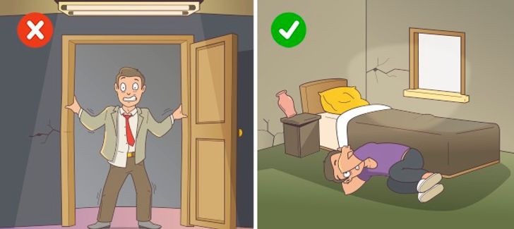 If you are in bed, stay in bed. This is partly due to having bare feet, and partly due to avoiding objects near the bed (like that lamp on your bed stand) falling on you. Protect your head/neck by turning on your tummy and putting a pillow and your hands over the back of your head.