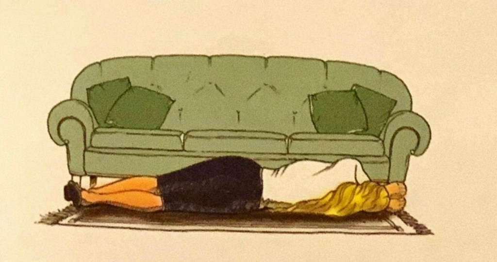 If you are not able to get under an object, don’t try to run to another room to get under an object. Instead get low to the ground next to a larger secure object, like a couch, so falling furniture or walls hit the large object before you. Do not confuse this with the erroneous “triangle of life” earthquake survival technique, which is not recommended. See details here.
