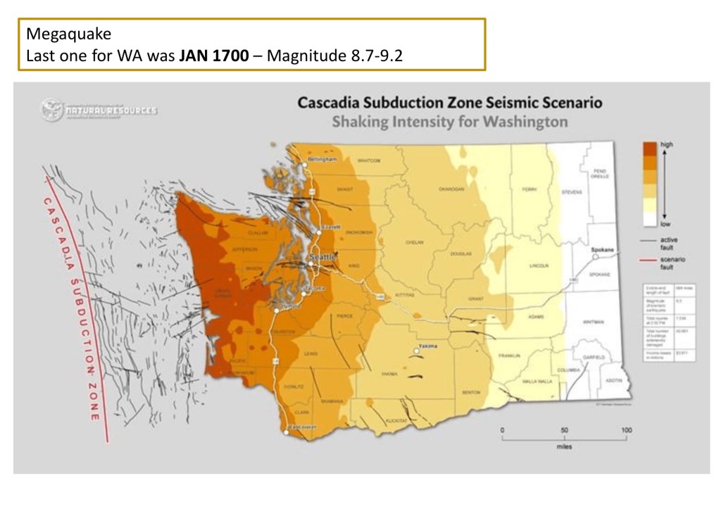 Seattle has three faults, including one that cuts right across the city. The most commonly known earthquake threat is, “the big one,” from a Ring of Fire/ Cascadia Subduction Zone earthquake; also known as “mega-thrust” or “mega-quakes.”