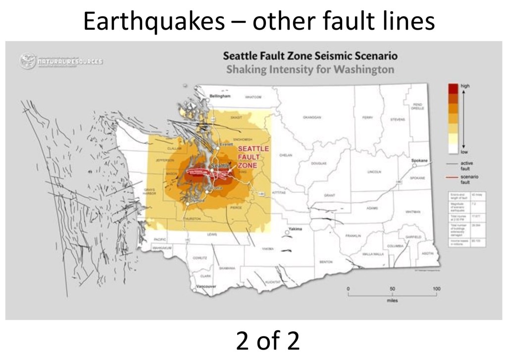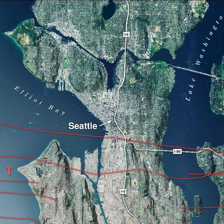 Lastly, the Seattle Fault Zone, which runs directly through Bainbridge Island, the International District (down by the stadiums) and right across the I-90 turn off.