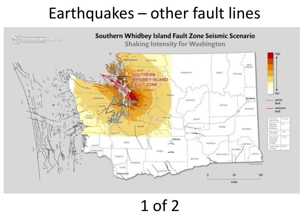 The least known Seattle fault threat is the Whidbey Island faults – this would impact directly north of Seattle as well as the San Juan islands. The 2019 Three Lakes quake was from this zone.