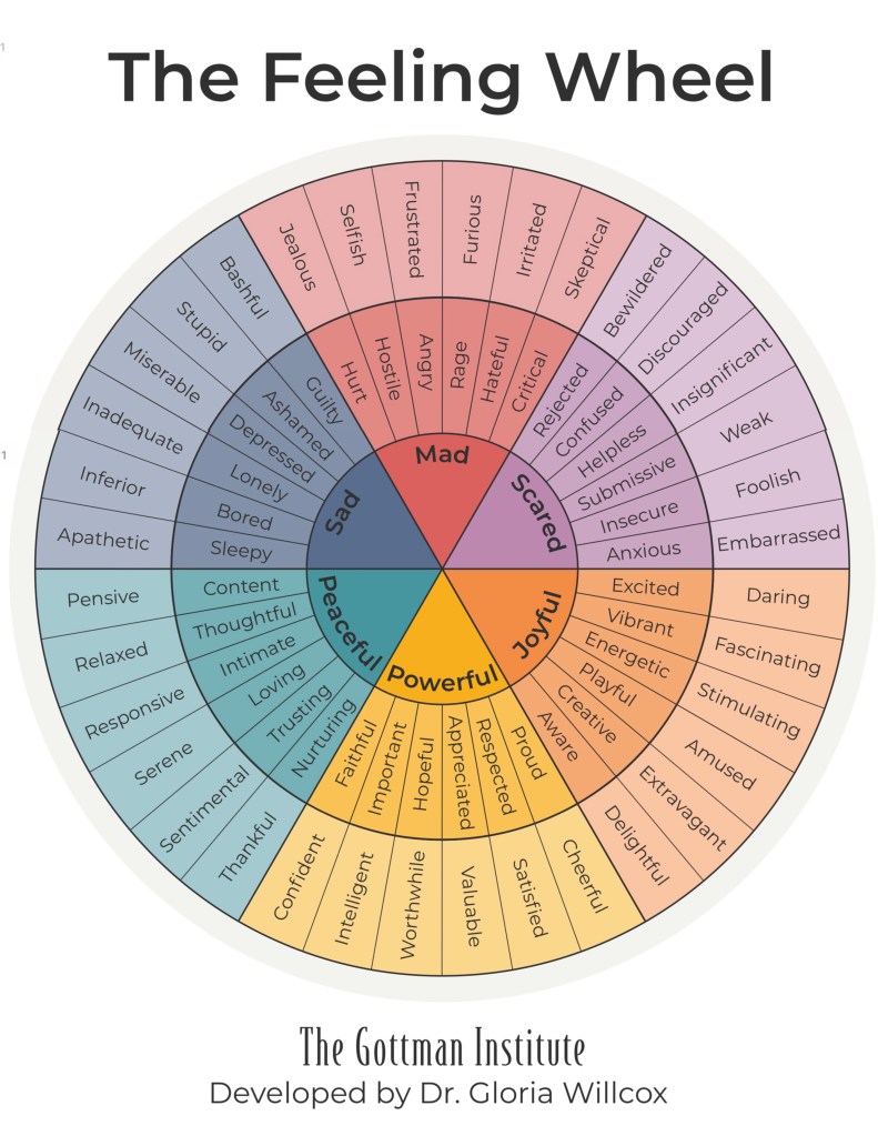 The Gottman Institute has provided this excellent example of a Feeling Wheel. Just like a color wheel or a flavor wheel, this visual offers a variety of words to help label or describe what you are feeling.