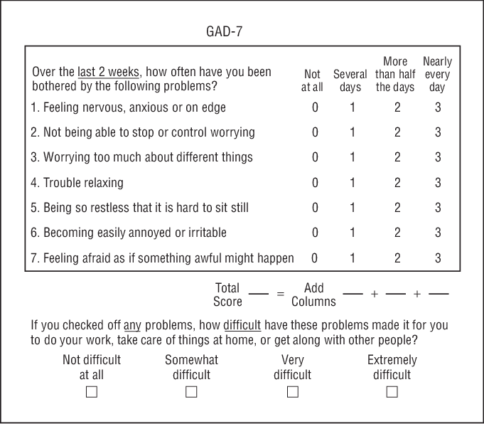 Anxiety is becoming more and more prevalent in our society, and it is not uncommon to see the GAD-7 screener for anxiety administered at the same time as the PQH-9. Here is an electronic version of the GAD-7 including scoring.