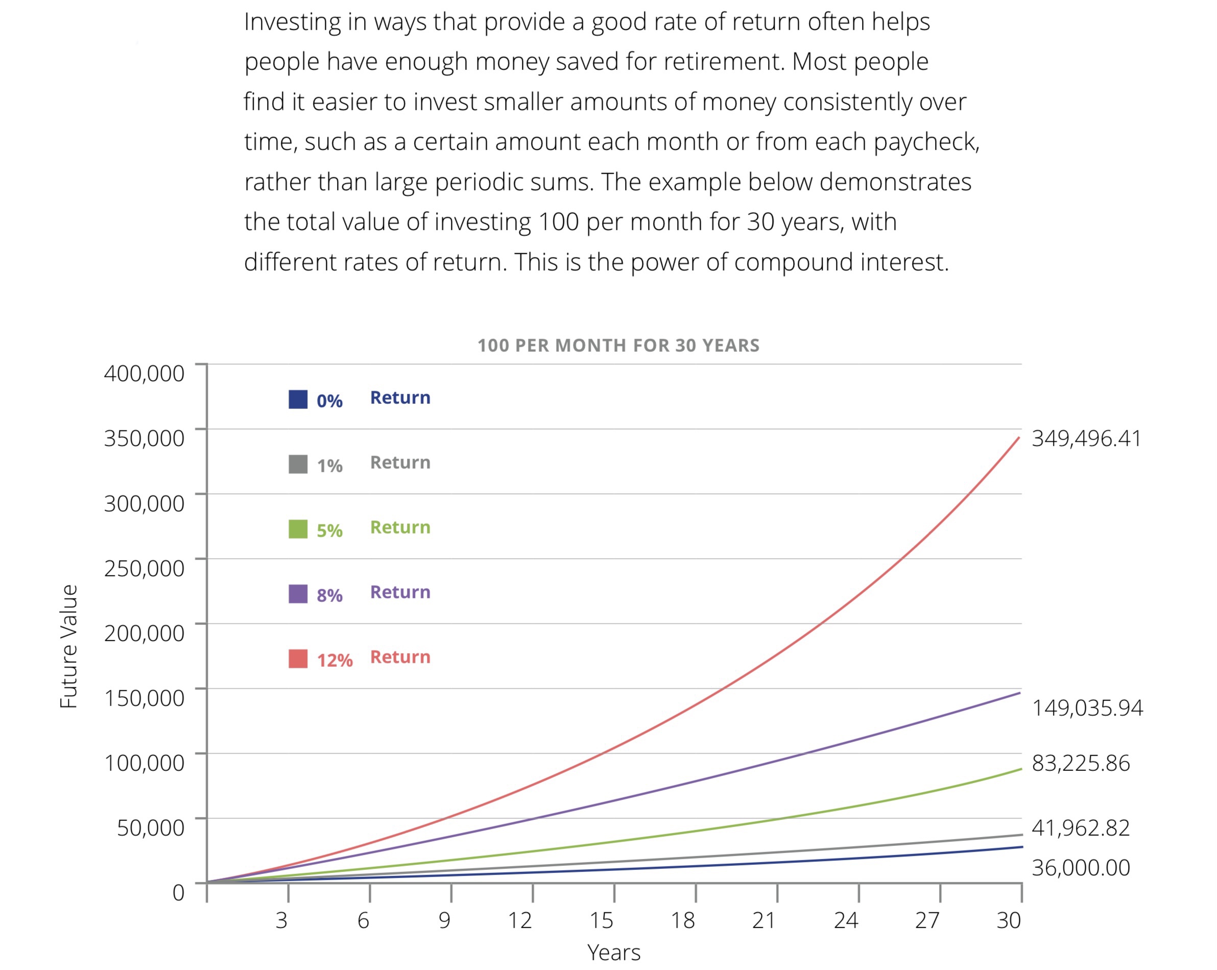Investing makes your money work for you, especially if you have time. The graph below (from the Self Reliance Personal Finance manual) illustrates this.