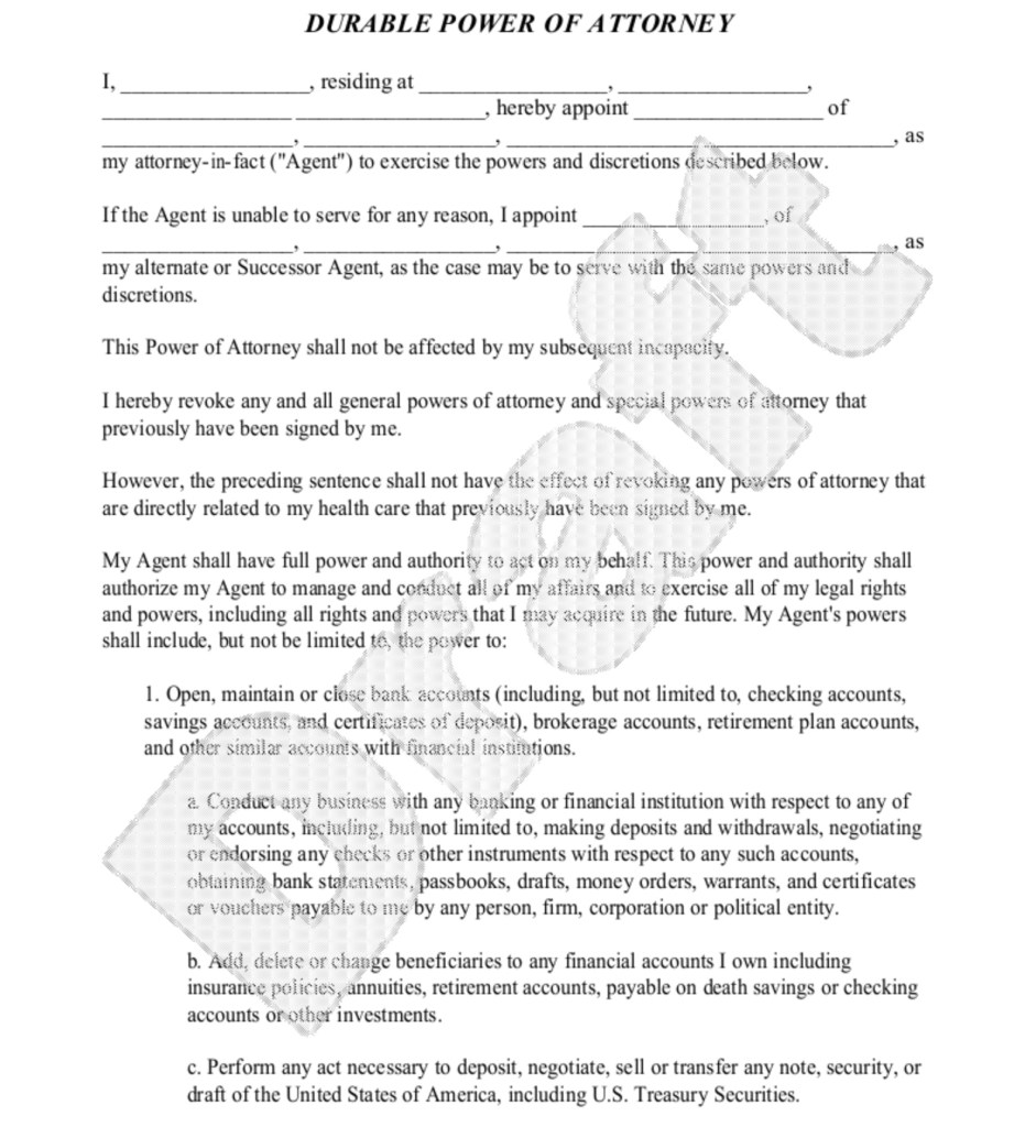 There are several different types of Power of Attorney (POA), for example the Living Will part of this website has talked about a POA with permissions to make medical decisions on your behalf if you are incapacitated. It is also important to have a POA who can have power over legal and financial matters. This includes signing checks, signing official documents, or handling other legal issues. Specifically for estate planning you want a Durable Power of Attorney (DPOA) who can act on your behalf if you are incapacitated, incompetent, or otherwise not able to handle your affairs. In legal speak, this person will be your agent.