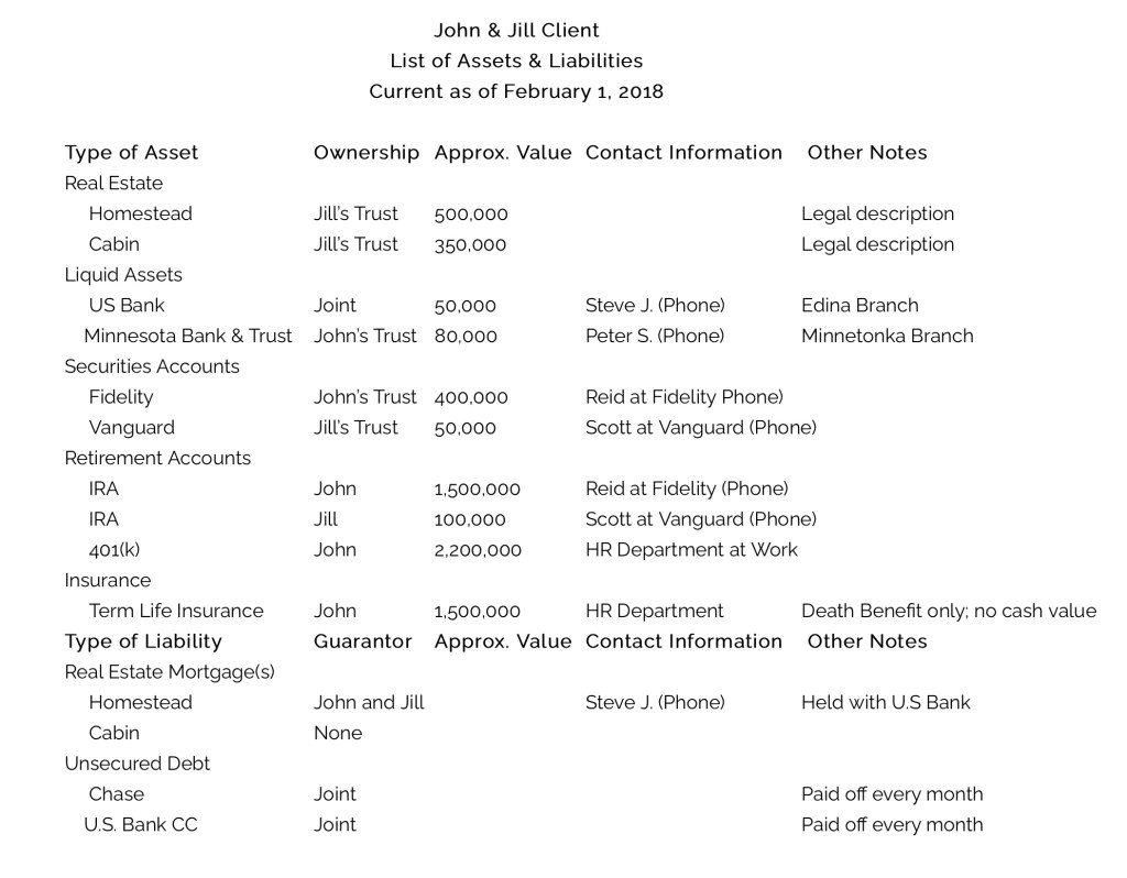 This type of document can be helpful in financial planning and should be updated at least once a year.