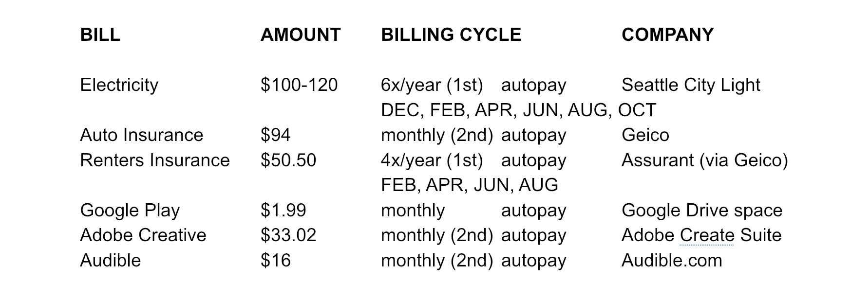 Make a list of Day to Day Bills. Think about if you were hospitalized and all of the sudden someone else had to make sure the bills got paid on time. Luckily, autopay helps a lot on this front. List monthly and annual payments. This list can also be helpful in financial planning. Here is an example to get your list started.