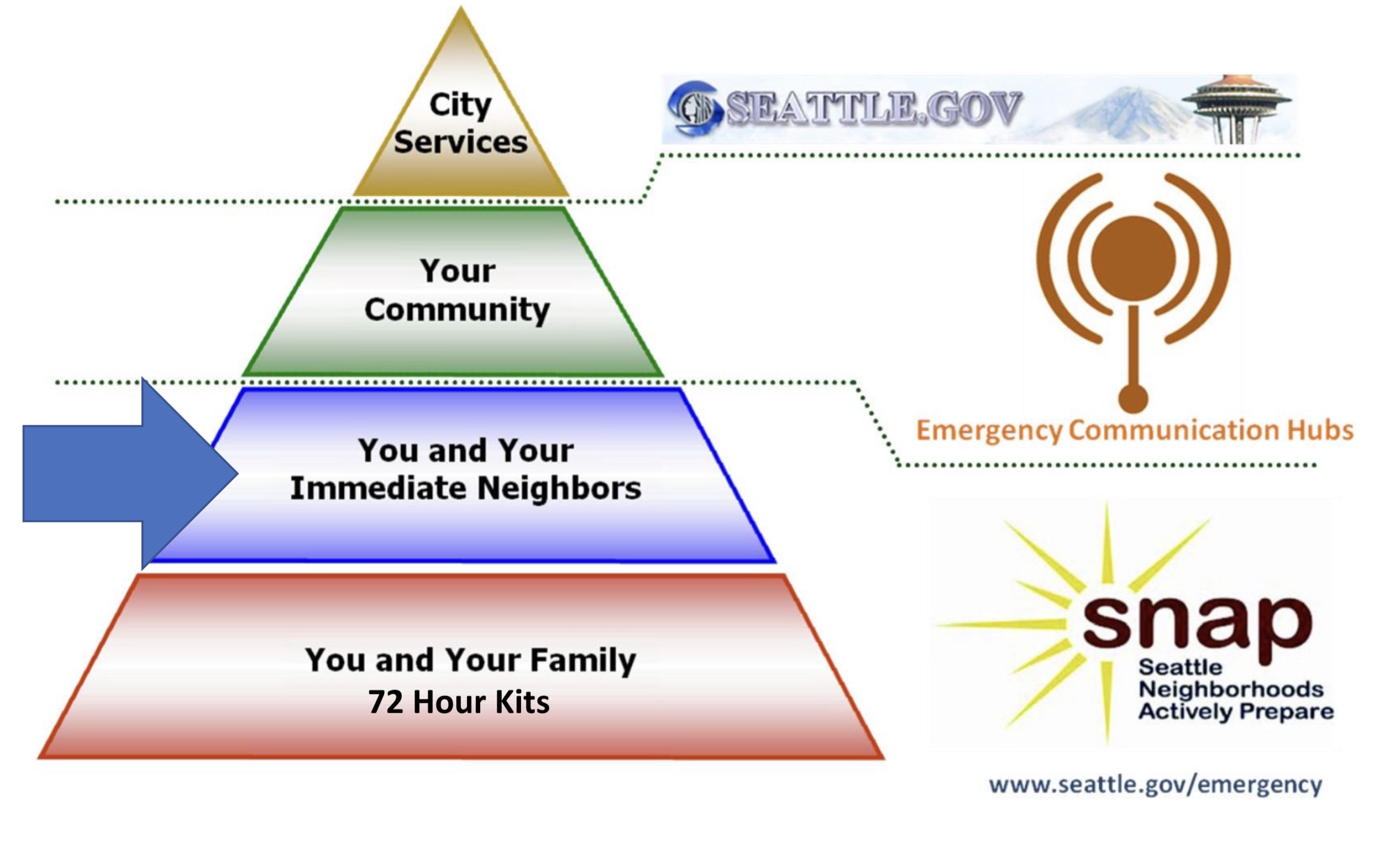 The city of Seattle has several layers of emergency preparation and response ranging from broad areas of the city, to more local neighborhoods. Part of this plan is that every individual also takes responsibility for being prepared. Below we will further explain these layers of preparedness.