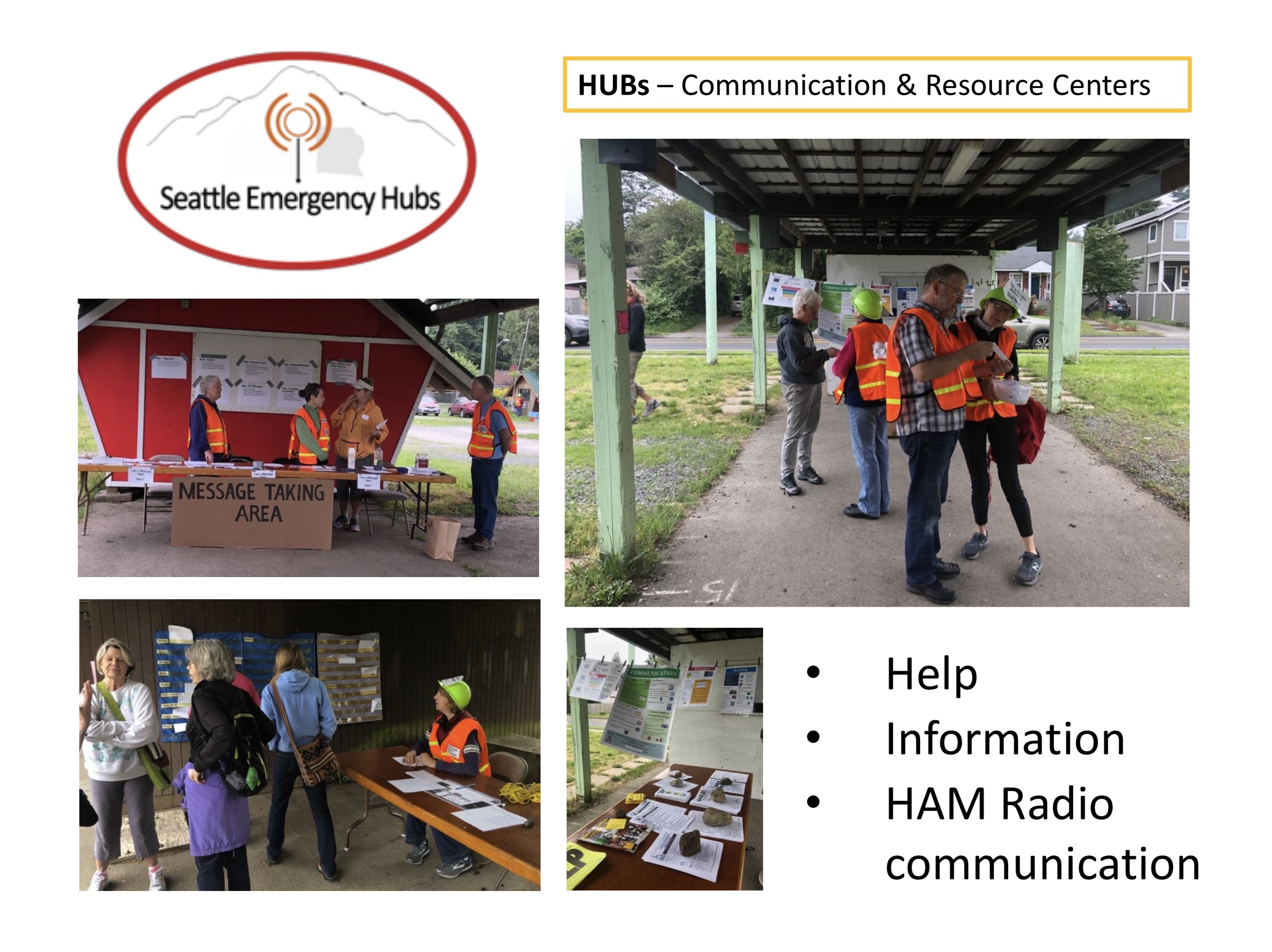 Seattle HUB locations are designed as spaces to exchange and learn information and gain resources after a major natural disaster. They are neighborhood specific and often outside. This is partly to accommodate those that may need to leave their homes, to allow large groups to congregate, and to not risk meeting in an at-risk building after a major earthquake.