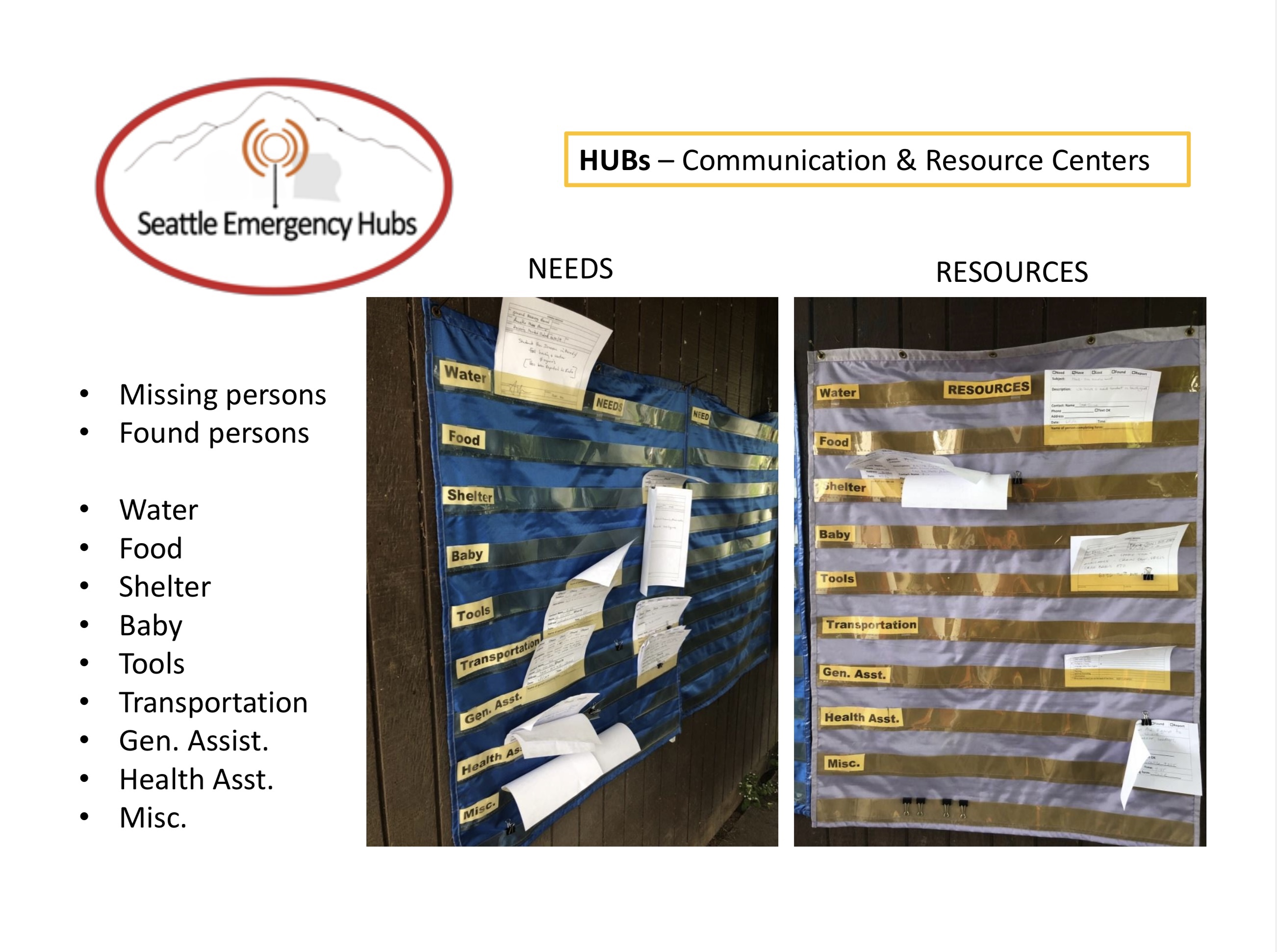 Hubs also have paper handouts with useful information for community members, such as Okay/Help signs, and how to turn off house utilities, etc… More details about what happens and is available at a hub can be found here.