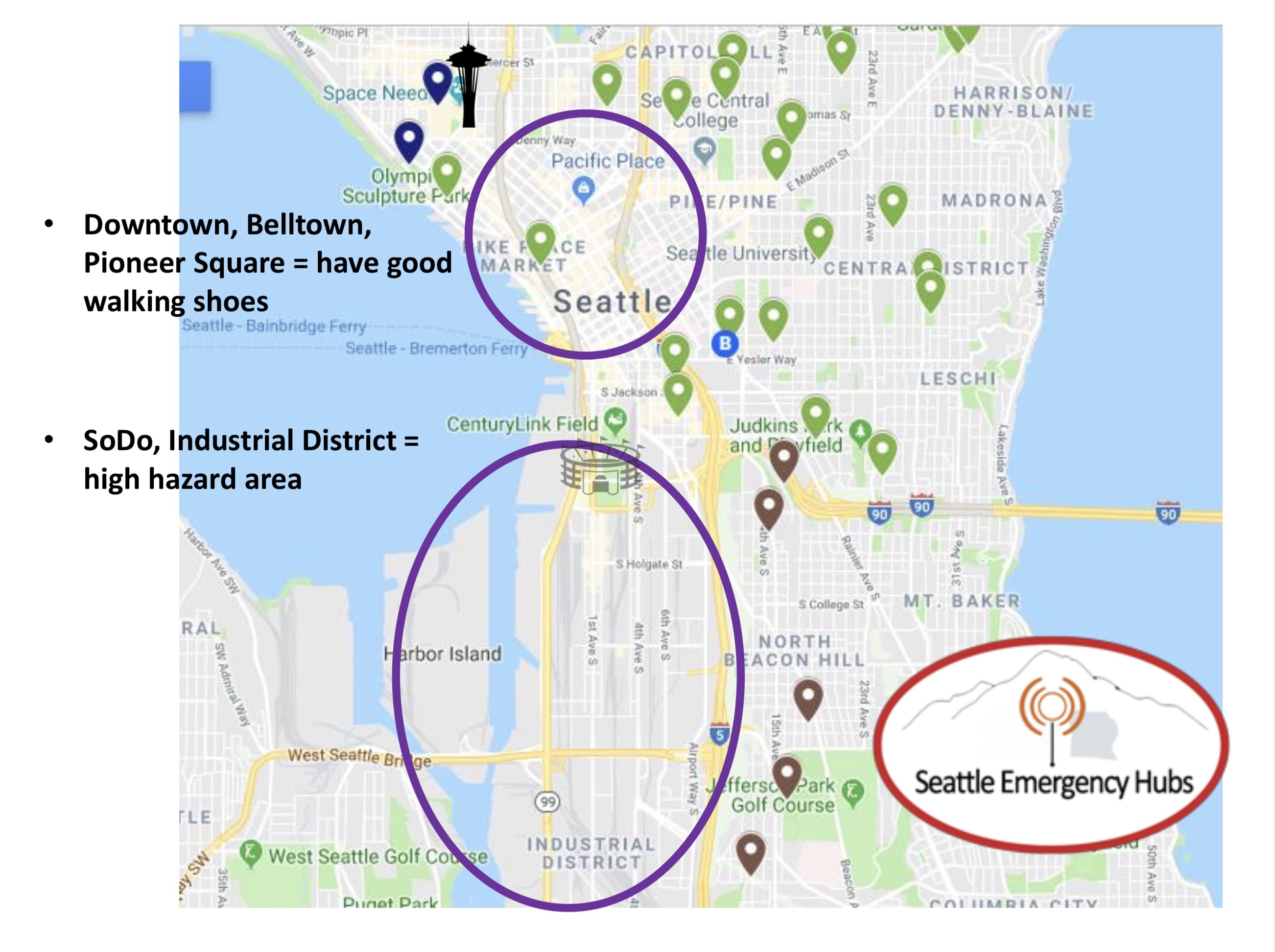 Note that there are very few HUB locations in downtown Seattle and south of the International District. This is due to not having a lot of park space in the downtown core. For the SODO area this is a high liquefaction zone where after an earthquake water comes up from the ground. As such, no emergency meeting places have been designated here.